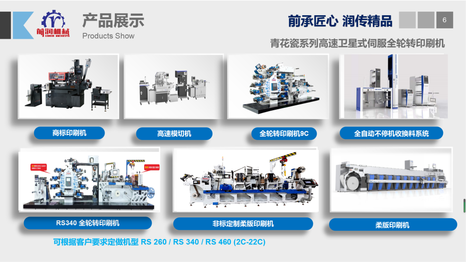 主營設備:商標印刷機、衛星式輪轉印刷機、模切機 等產品,公司可為客戶量身制定商標機、輪轉機等自動化解決方案。公司有強大的研發體系,確保能為客戶量身定制各類非標且最有價值的產品;前潤機械在國內外擁有極高的市場占有率及良好的信譽,贏得了眾多知名企業的青睞與合作,產品暢銷多個國家和地區,市場銷量近萬臺;我們愿與您攜手合作,建立長久雙贏機制,共享成功喜悅!加盟熱線:133 2260 8282