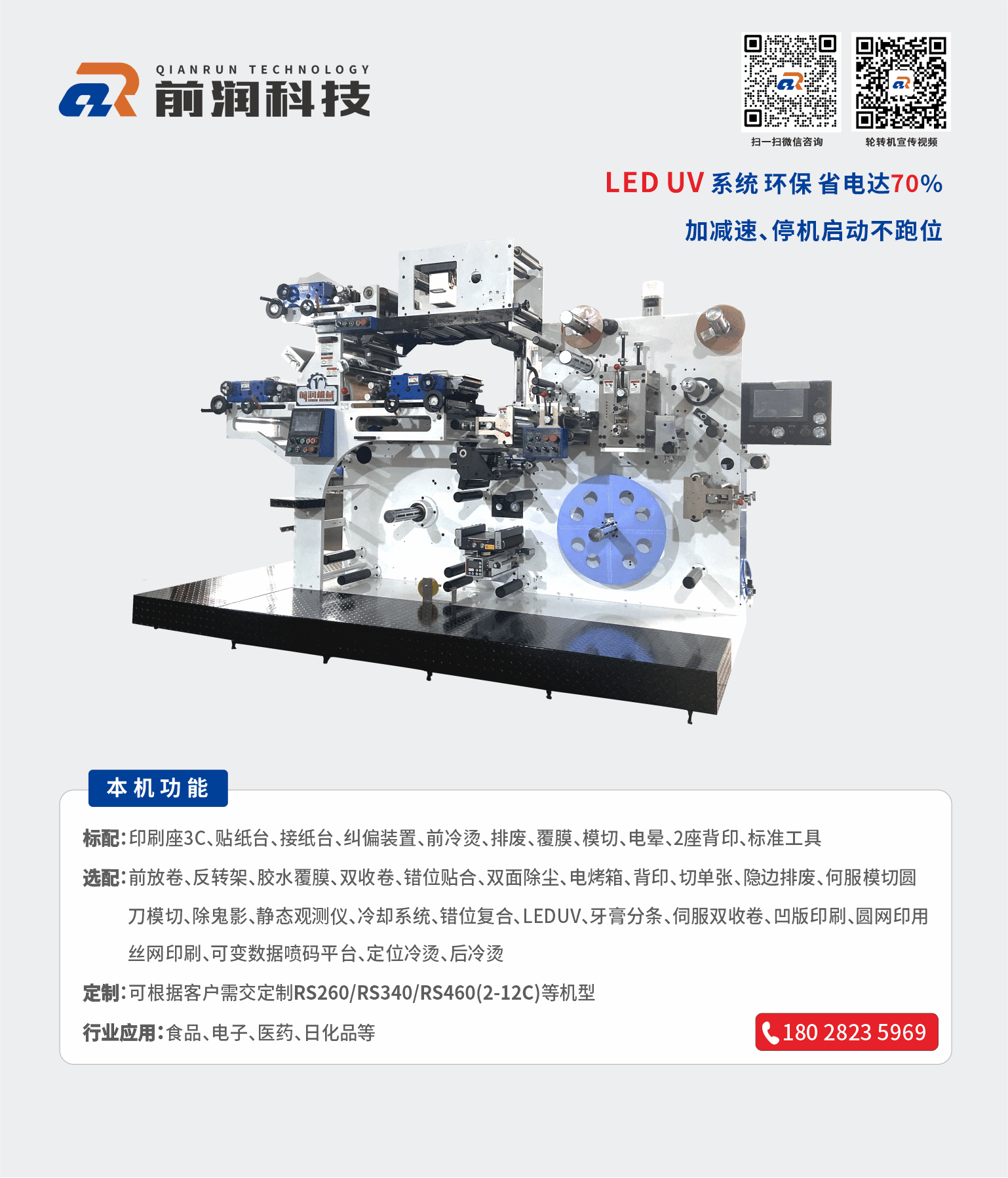 主營設(shè)備:商標(biāo)印刷機、衛(wèi)星式輪轉(zhuǎn)印刷機、模切機 等產(chǎn)品,公司可為客戶量身制定商標(biāo)機、輪轉(zhuǎn)機等自動化解決方案。公司有強大的研發(fā)體系,確保能為客戶量身定制各類非標(biāo)且最有價值的產(chǎn)品;前潤機械在國內(nèi)外擁有極高的市場占有率及良好的信譽,贏得了眾多知名企業(yè)的青睞與合作,產(chǎn)品暢銷多個國家和地區(qū),市場銷量近萬臺;我們愿與您攜手合作,建立長久雙贏機制,共享成功喜悅!加盟熱線:133 2260 8282