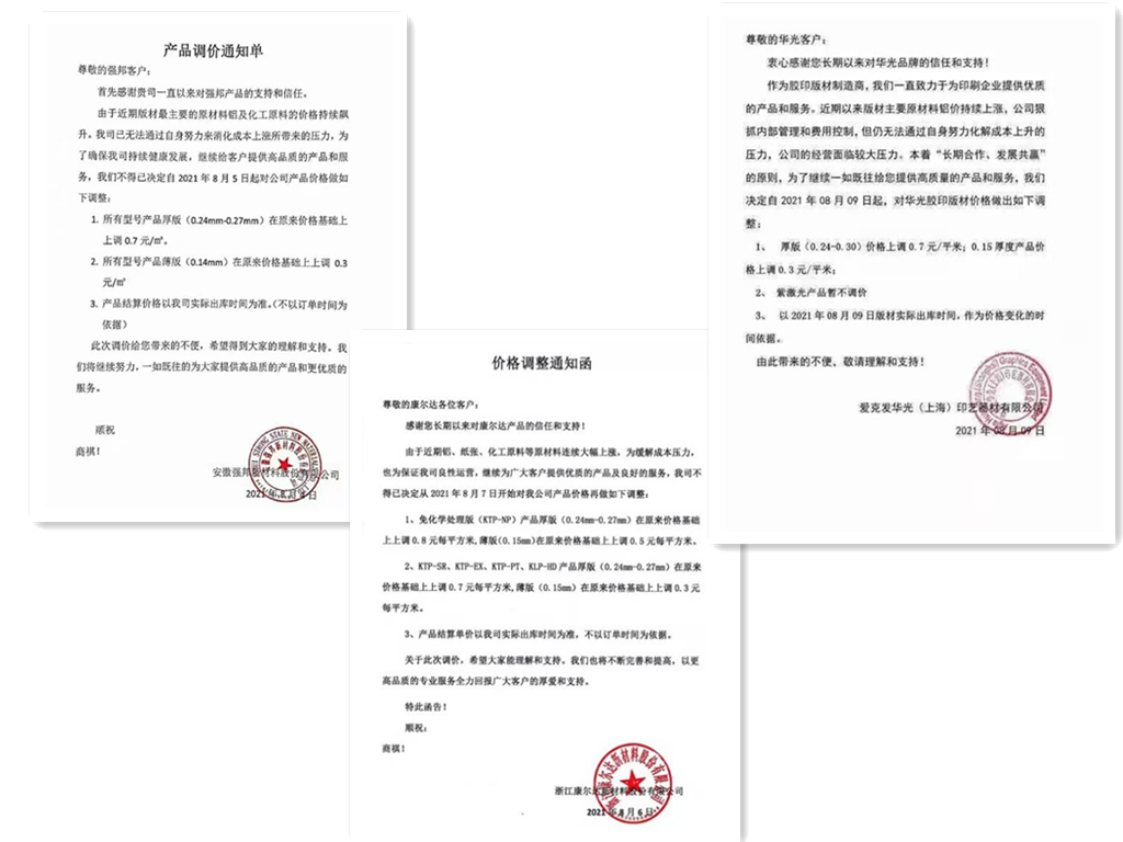 從這三家印刷版材漲價函看,版材上漲原因為原材料鋁及化工原料價格上漲,而各大版材公司無法通過自身努力來消化成本上漲所帶來的壓力。各版材制造商均表示,漲價均以實際出庫時間為準,而不以訂單時間為依據。