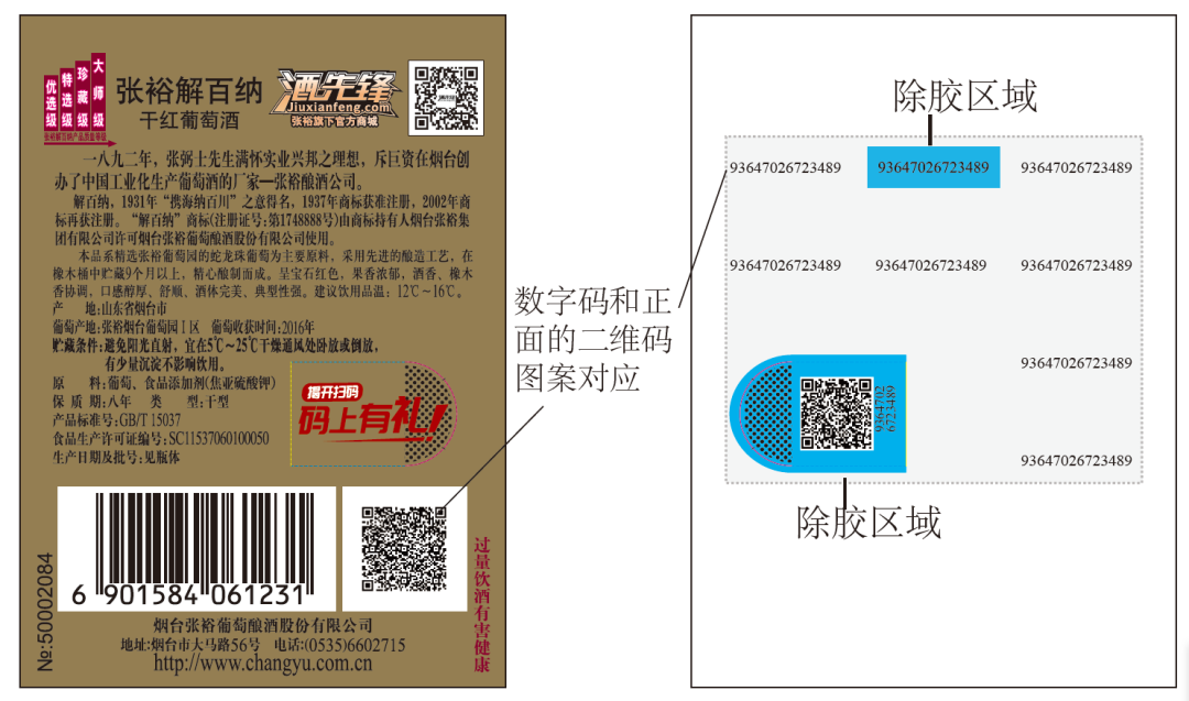 從圖中可以看到,標簽的正面噴印追溯二維碼,防偽數字碼和背面除膠區域噴印,其他背面區域噴印防竄數字碼,正面局部做了撕拉口設計。